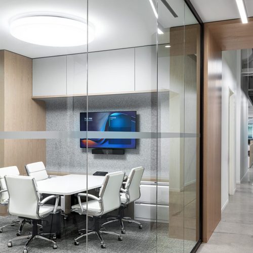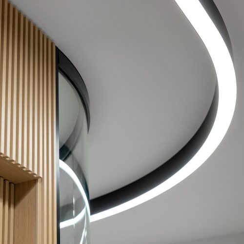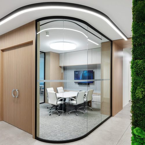 The design was characterized by soft curves, evident in features like the curved boardroom glazing and custom lighting that enveloped the exterior as well as curved millwork details.