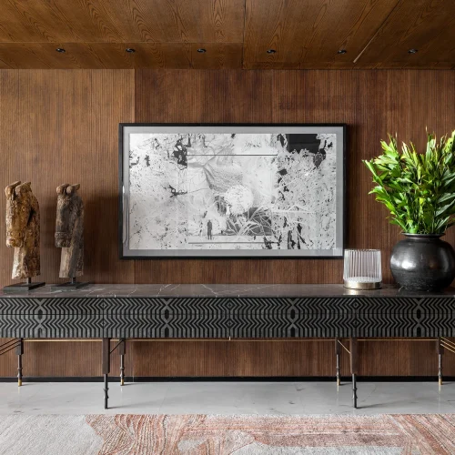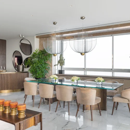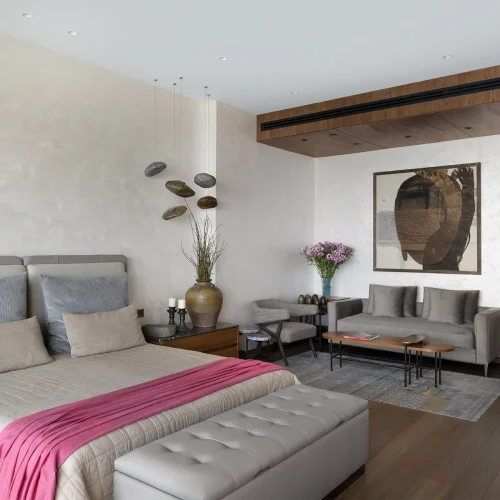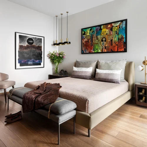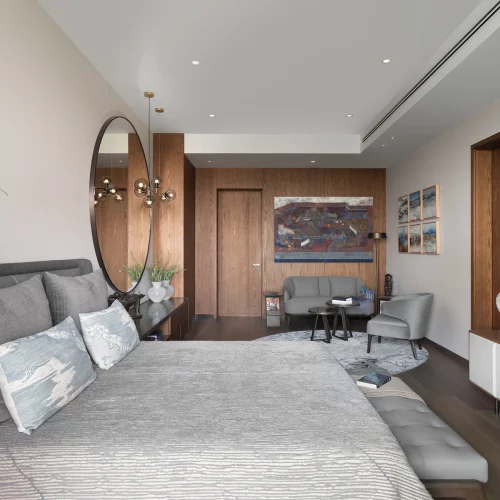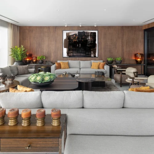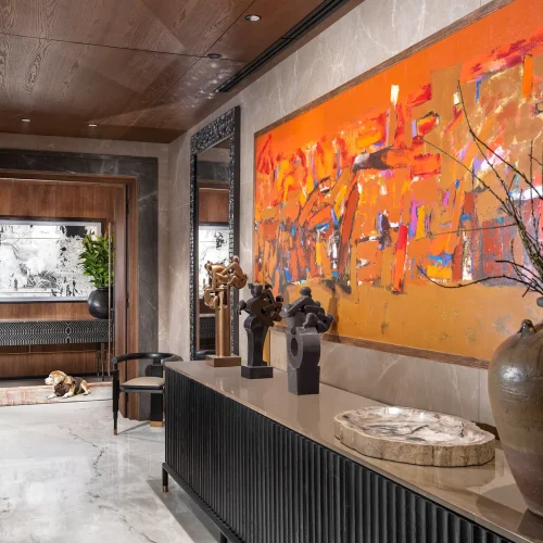 The interiors feature a harmonious mix of wood, marble, and neutral tones accented with bold artwork and sculptural decor.