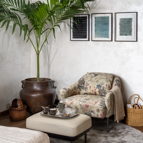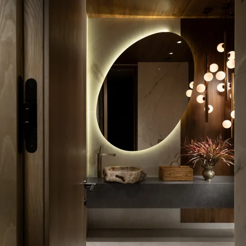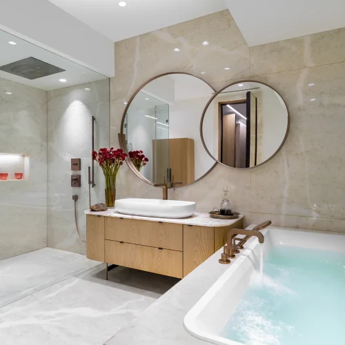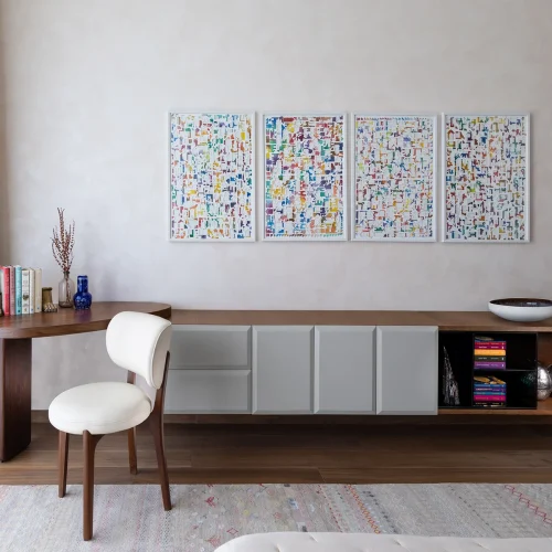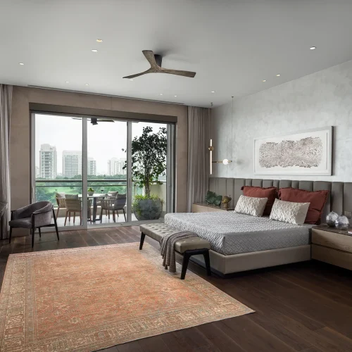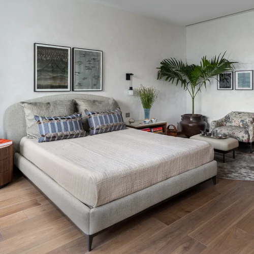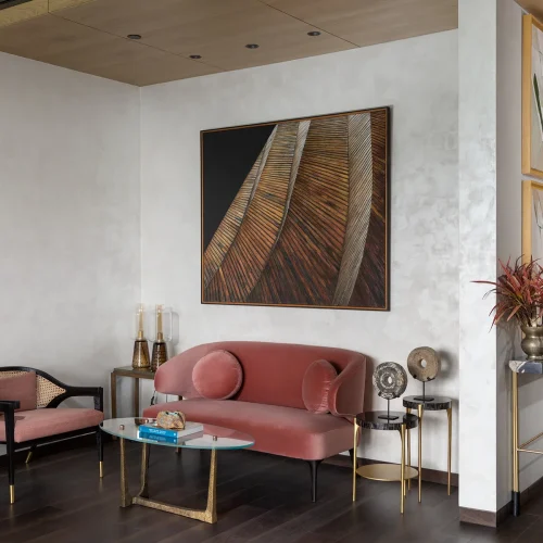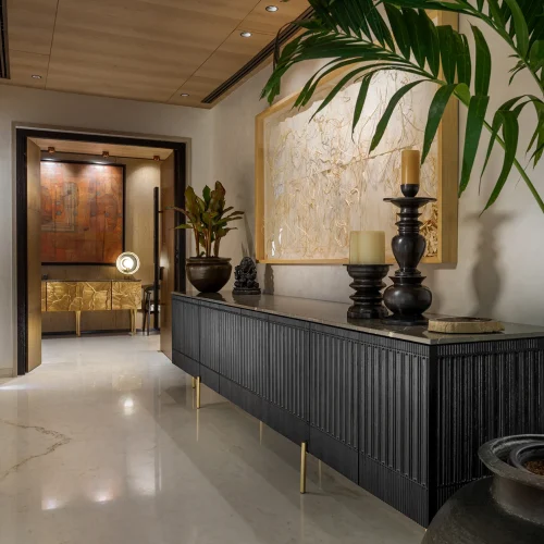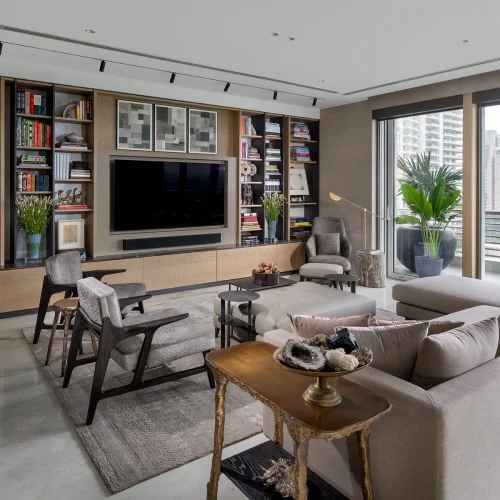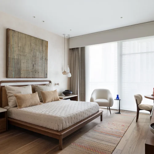 The design features a harmonious blend of warm neutrals, rich textures, and curated art pieces, creating spaces that feel both luxurious and inviting.